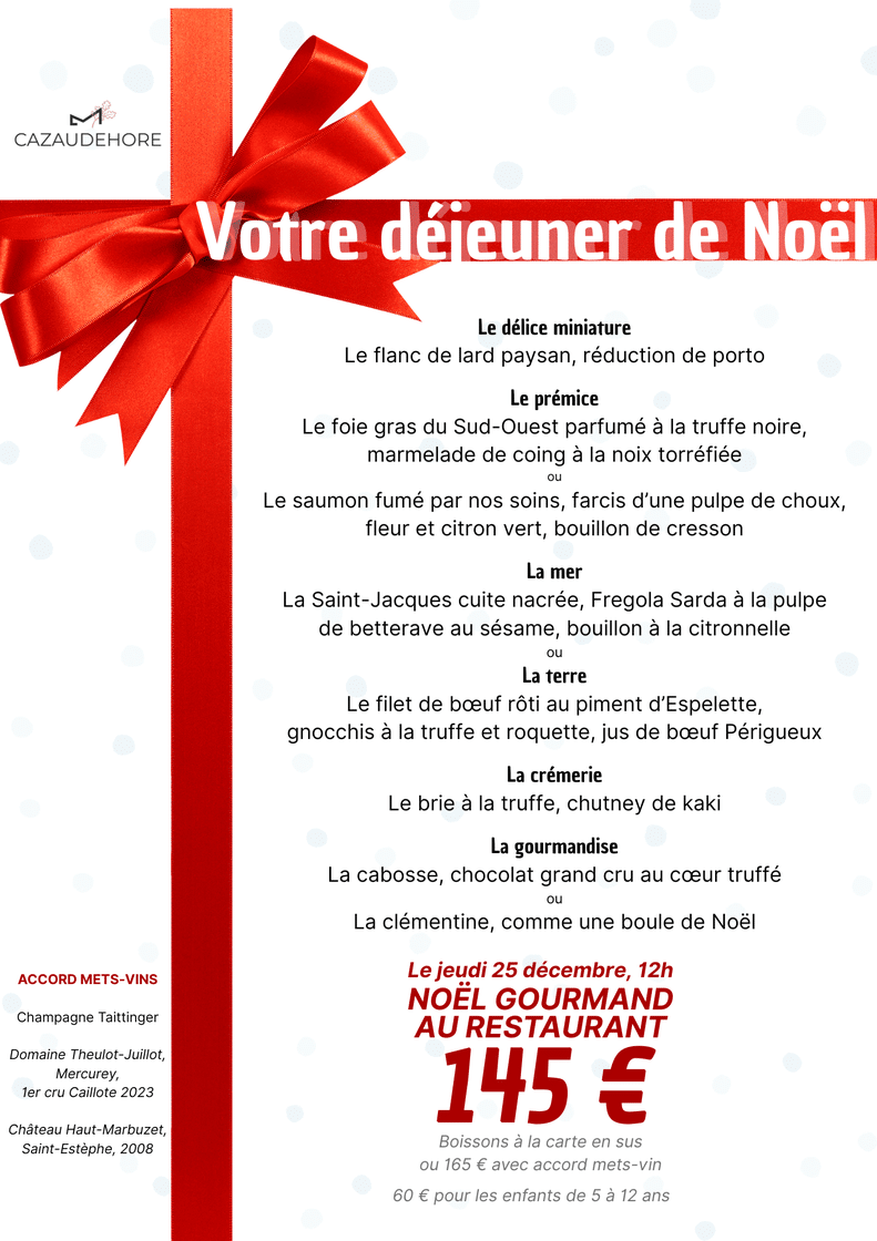 Après la magie du réveillon de Noël, prolongez le plaisir autour d’un déjeuner chez Cazaudehore. Le 25 décembre à midi, notre table se pare de ses plus beaux atours.